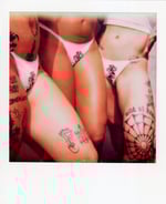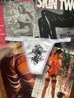 A sexy g string thong with screen printed tribal rose design, featuring a lace trim